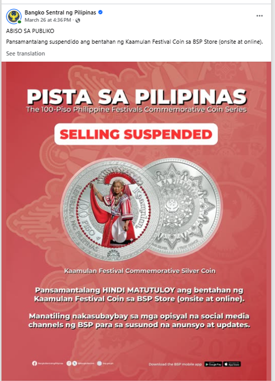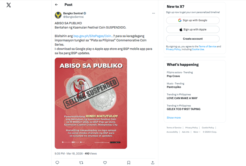 March 18, 2026 – BSP announced the suspension of the sale of the Kaamulan commemorative coins through its official X (Twitter) account, ahead of the scheduled March 19 release at the Kaamulan grounds in Malaybalay City.
