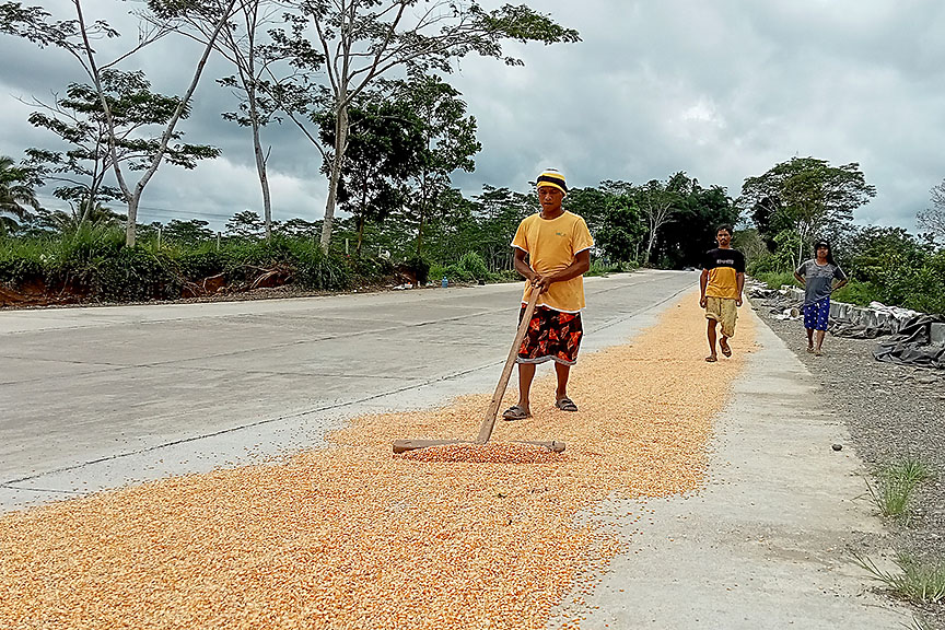 A farmer dries yellow corn along the highway in Barangay San Rafael, Talakag, Bukidnon noon on Tuesday (24 May 2022). Courtesy of MindaNews