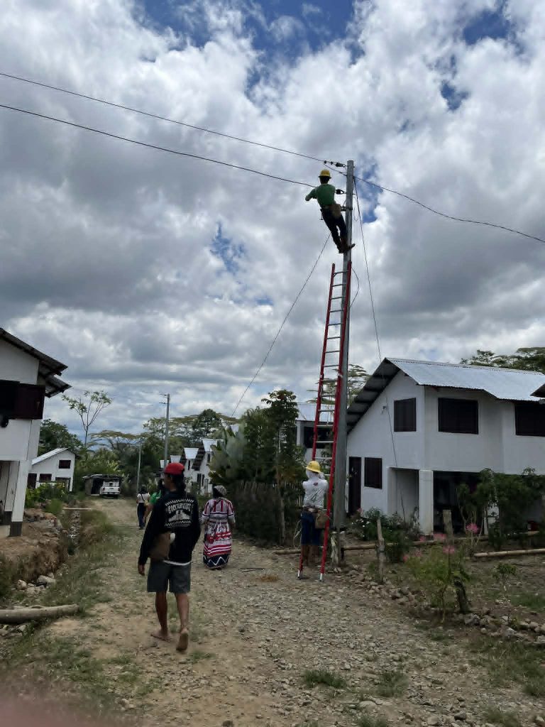 As festival activities unfold, line personnel from Bukidnon Second Electric Cooperative work on the installation of electric wires for the energization project.